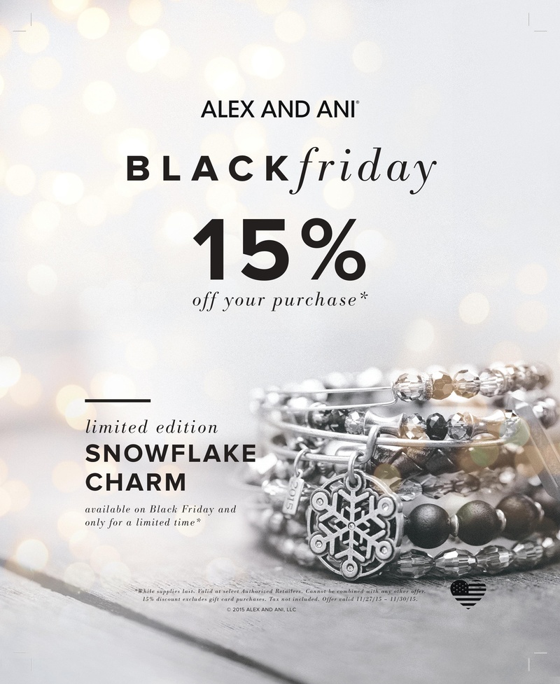 - Black Friday 2015 Every Fashion Sale You Need To Know About Glamour , Shop Alexandani.com Or Any Alex & Ani Retail Or Outlet Location From Now Though Cyber Monday, December 2Nd, To Get 30% Off Your Entire Purchase.